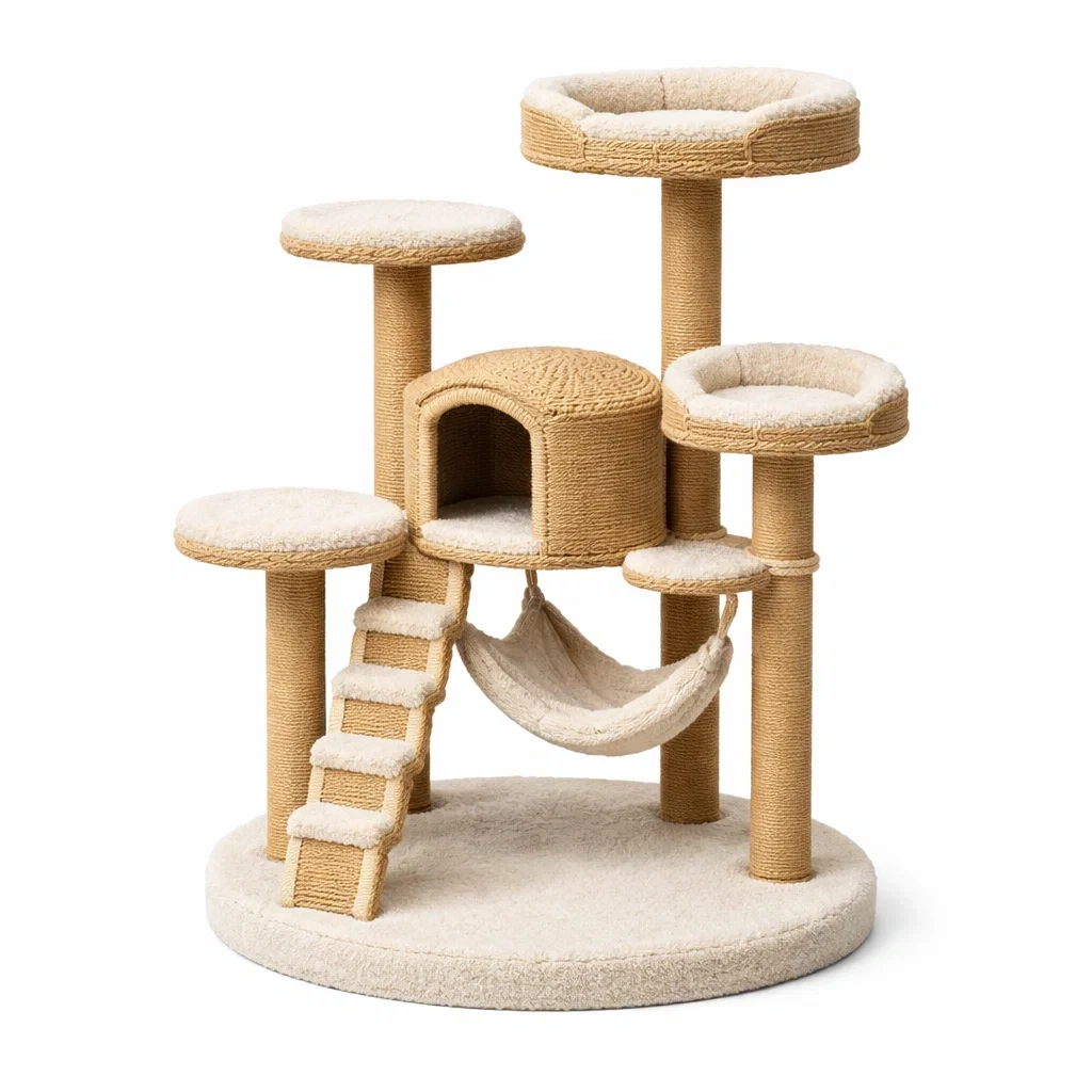 Tiragraffi per gatti in sisal e fibra di poliestere beige con cuccia e amaca