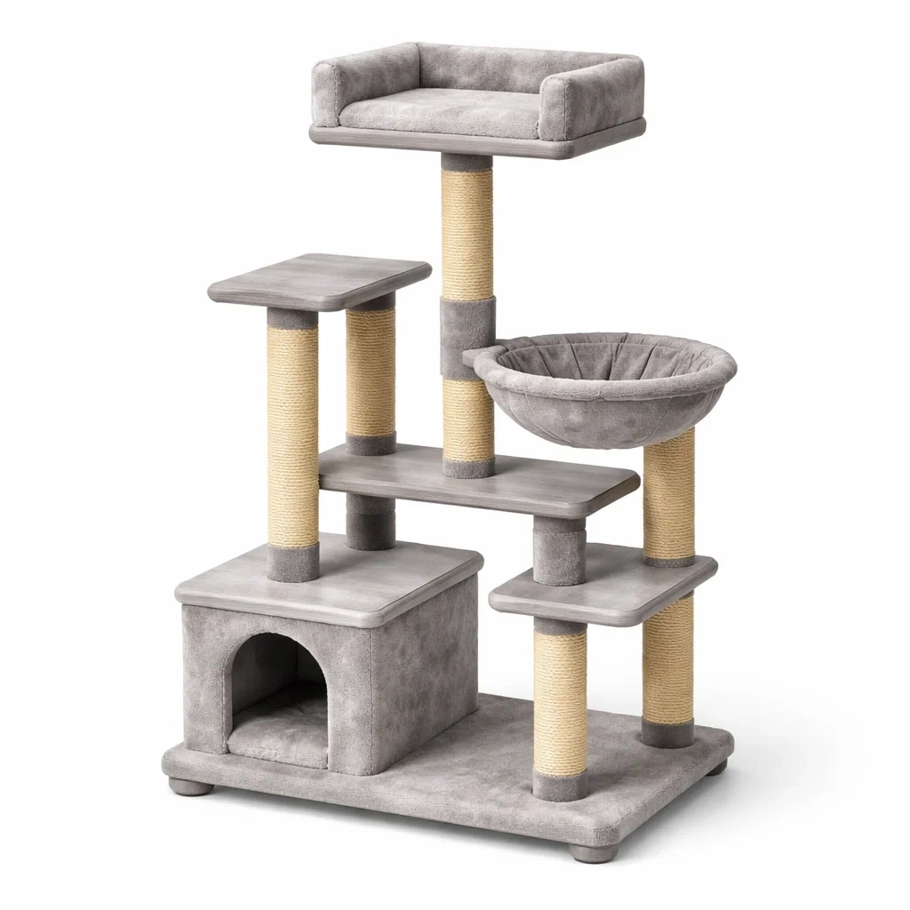 Tiragraffi per gatti in MDF e peluche grigio con ripiani e amaca