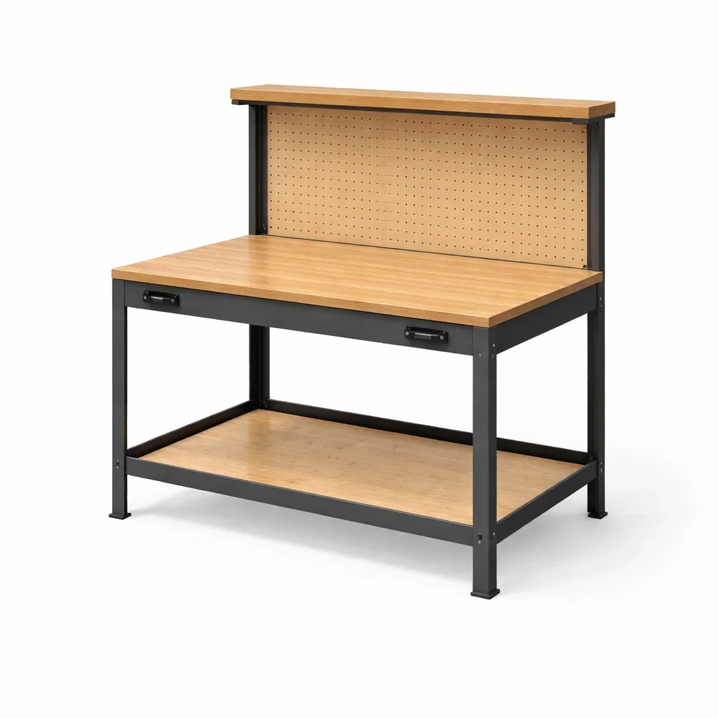 Banco da lavoro con struttura in acciaio e ripiano in legno compensato.
