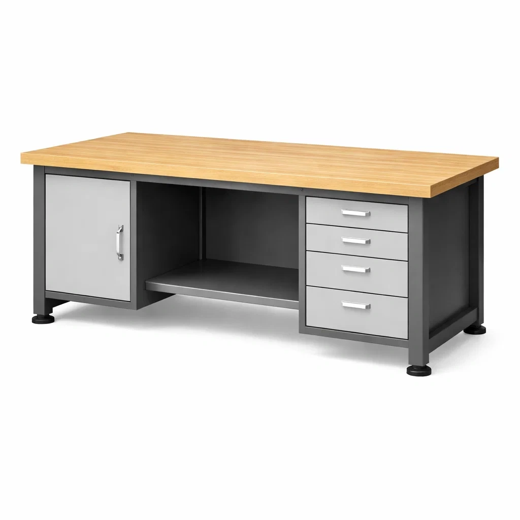Banco da lavoro con struttura in metallo e piano in legno laminato. Dispone di quattro cassetti e uno sportello, offrendo uno spazio aperto per riporre strumenti. Dimensioni: 150x60x85 cm. Capacità di carico: 100 kg.