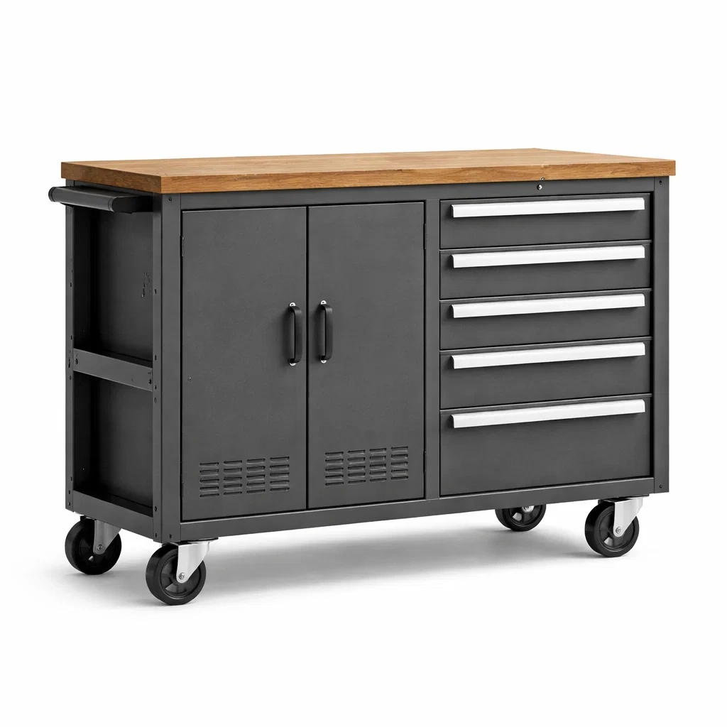 Carrello da officina con struttura in acciaio verniciato e piano in legno di quercia. Dotato di 5 cassetti e 2 ante per lo stoccaggio degli utensili. Le maniglie ergonomiche facilitano l'apertura. Equipaggiato con ruote robuste per facile movimento. Capacità di carico: 100 kg. Adatto per ambienti interni.