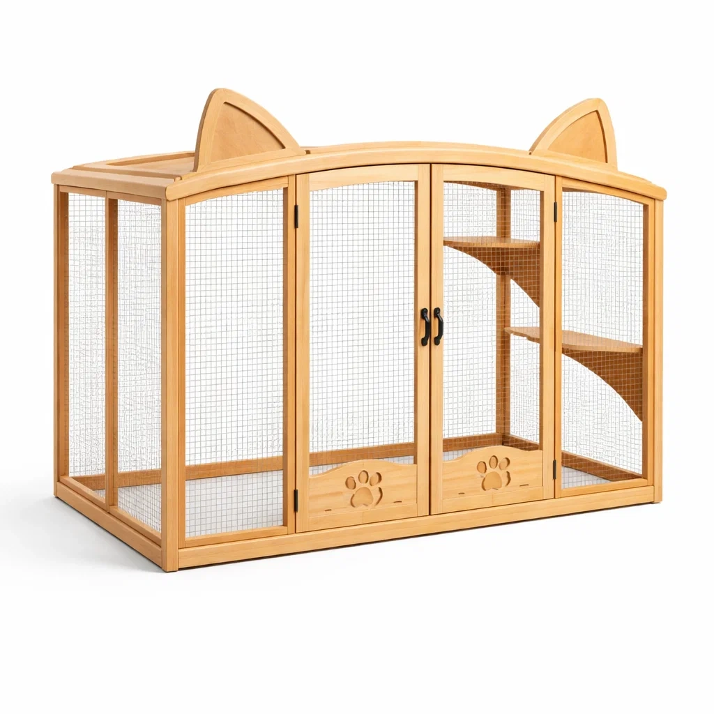 Il colore naturale si integra con il design caratterizzato da un tetto ad arco e due ripiani interni. Dettagli decorativi includono un disegno a zampe sulla porta.