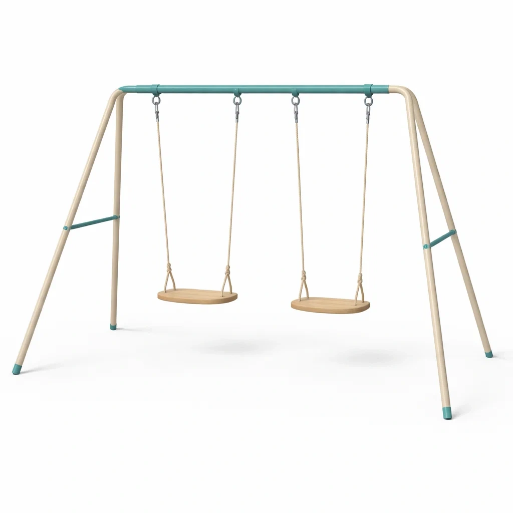 Altalena doppia per bambini con struttura in acciaio verniciato e sedute in legno di pino.